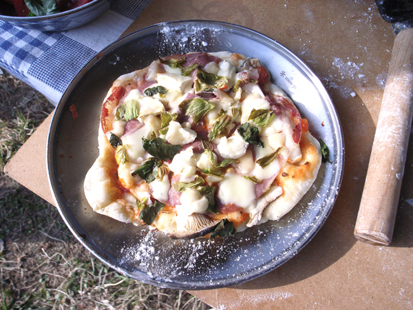 キノコ、生ハムにチーズ3種、それにそこらで採ったふきのとうとフレッシュバジル。